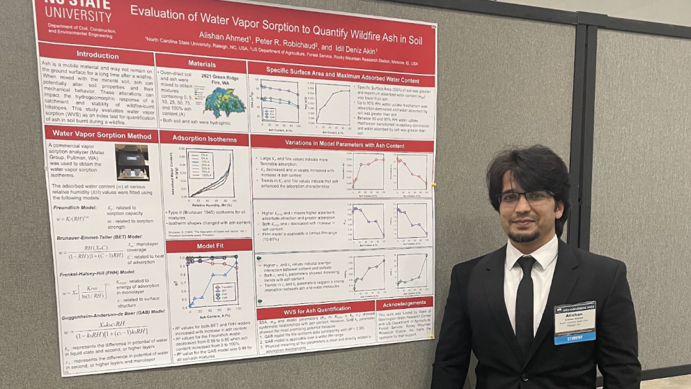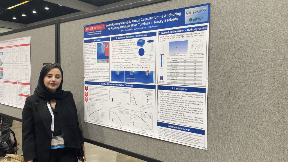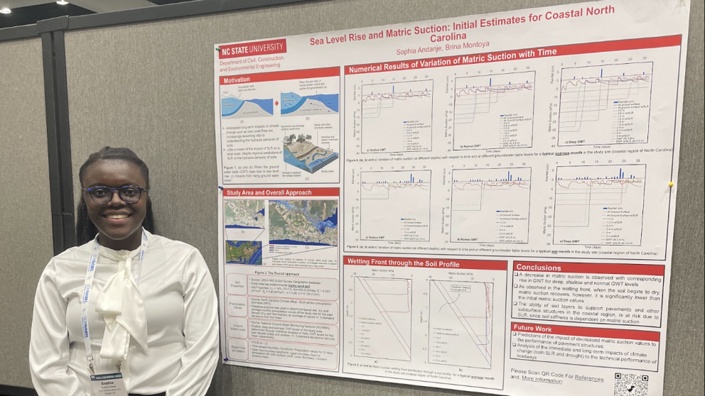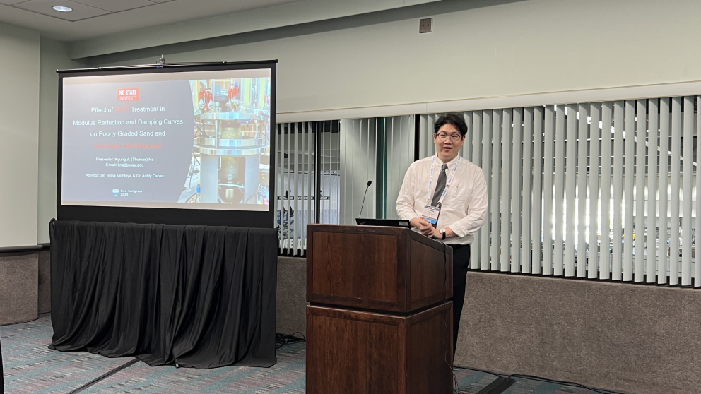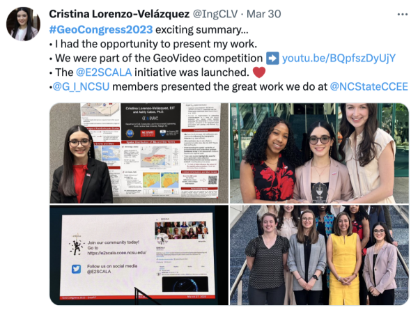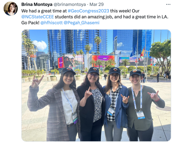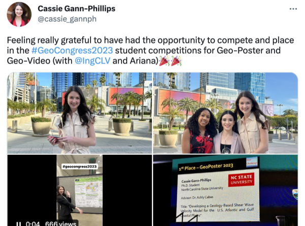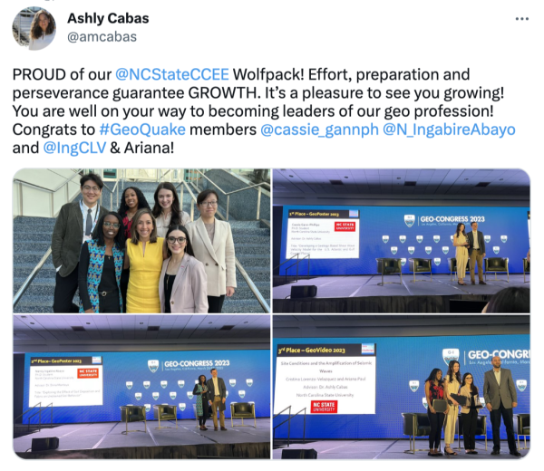 - Ph.D. students Cassie Gann and Nancy Ingabire Abayo won first and second place, respectively in the Geo-Poster competition, where students share their research outcomes through poster presentations. Gann’s poster was titled “Developing a Geology-based Shear Wave Velocity Model for the U.S. Atlantic and Gulf Coastal Plains,” and Abayo’s poster was called “Exploring the Effect of Soil Deposition and Fabric on Undrained Soil Behavior.